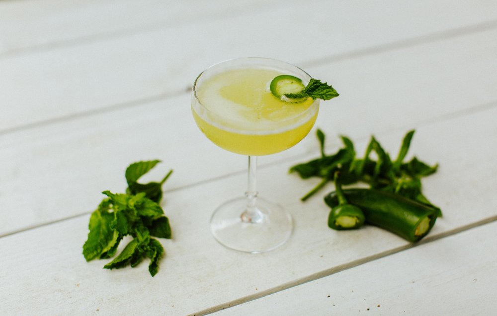 Method: Pluck mint leaves and put into shaker (do not muddle), combine remaining ingredients into shaker, add ice and shake hard for 10 seconds, strain into a coupé glass, garnish with a single mint leaf, muddle one jalapeño slice into the shaker.